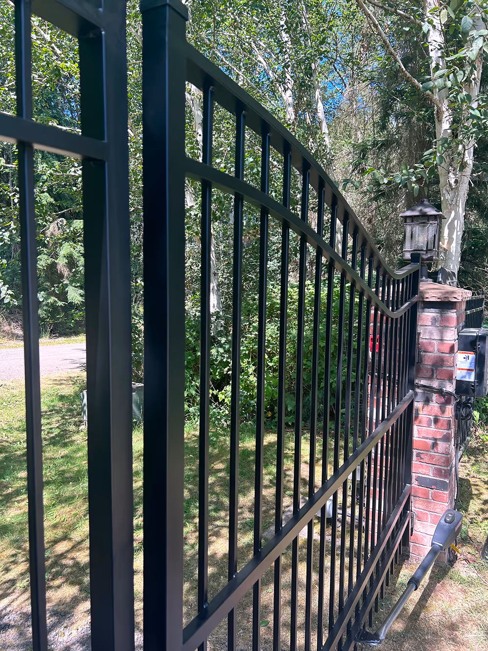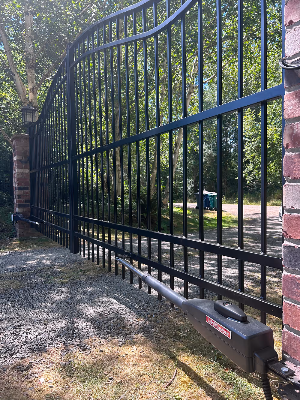 The gate is powder-coated black for maximum weather resistance. We integrated long-range remote access, allowing the owner to control the entrance from anywhere on the farm.